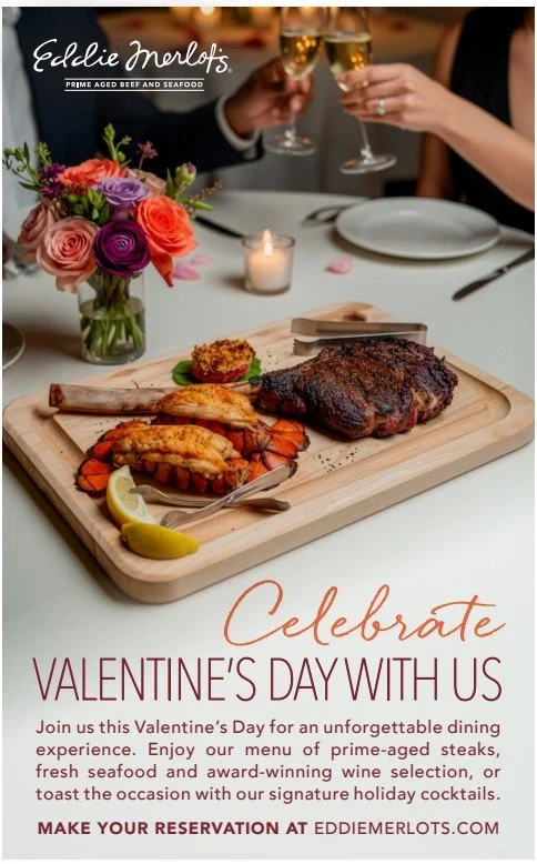 Celebrate your sweetheart at Eddie Merlot’s all week long, and make your reservation to join us for dinner. We’ll be serving our full dinner menu of signature classics, including our prime-aged steaks, fresh seafood and signature cocktails, perfect for the occasion.