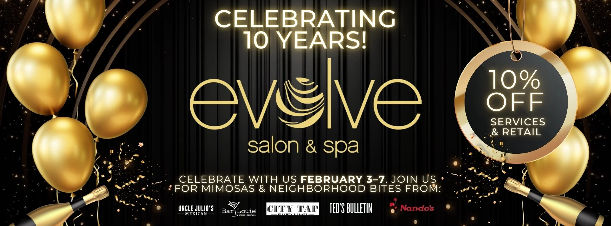 Join us February 3–7 as we celebrate a decade of beauty, community, and growth at Evolve Salon & Spa! We’re offering 10% off all services and products all week, plus mimosas to toast the occasion.
