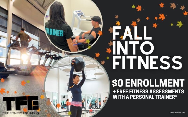 It's Time to Fall into Fitness at TFE! Enjoy $0 enrollment fee and free fitness assessments with a personal trainer*! Recharge your energy, find your Fall groove, and prioritize your health and well-being with some of our amazing services and amenities.